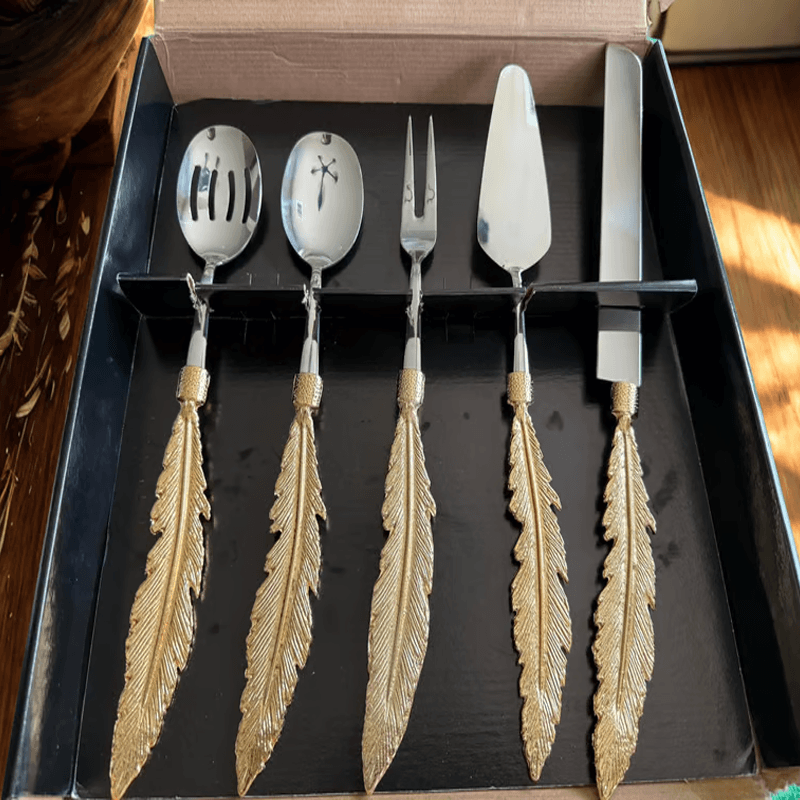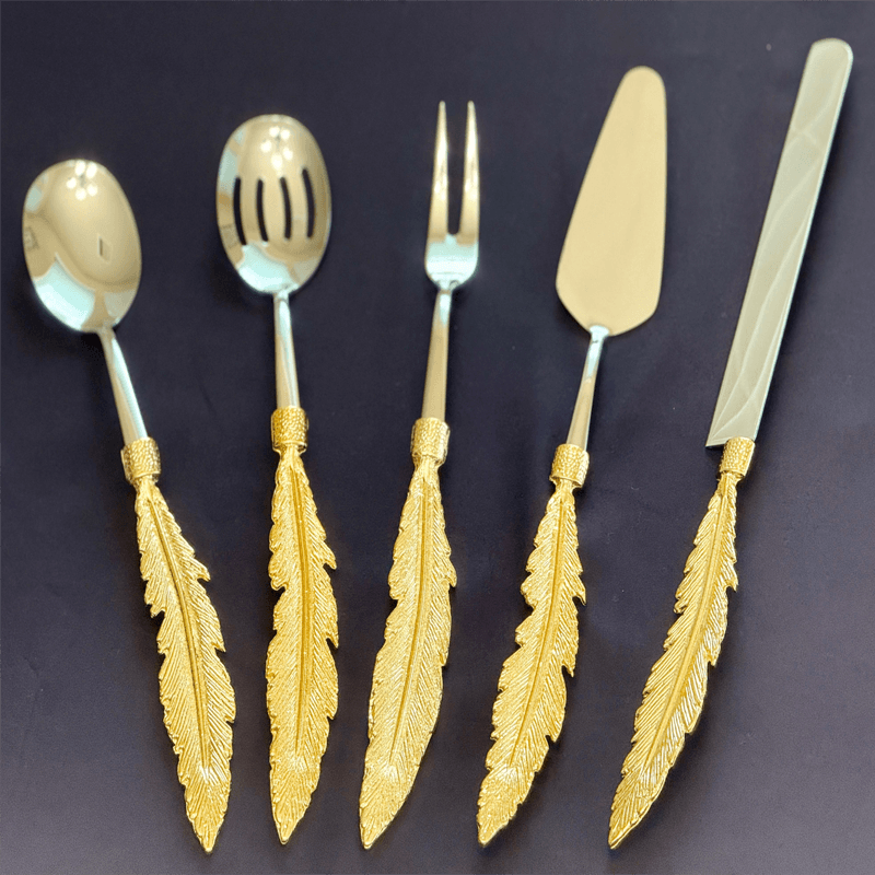 This 5-piece serving set features gold feather handles, perfect for upscale dining, gifting, or special occasions. The set includes a slotted serving spoon, solid serving spoon, serving fork, cake server, and cake knife. Ideal for weddings, parties, or luxury home dining.